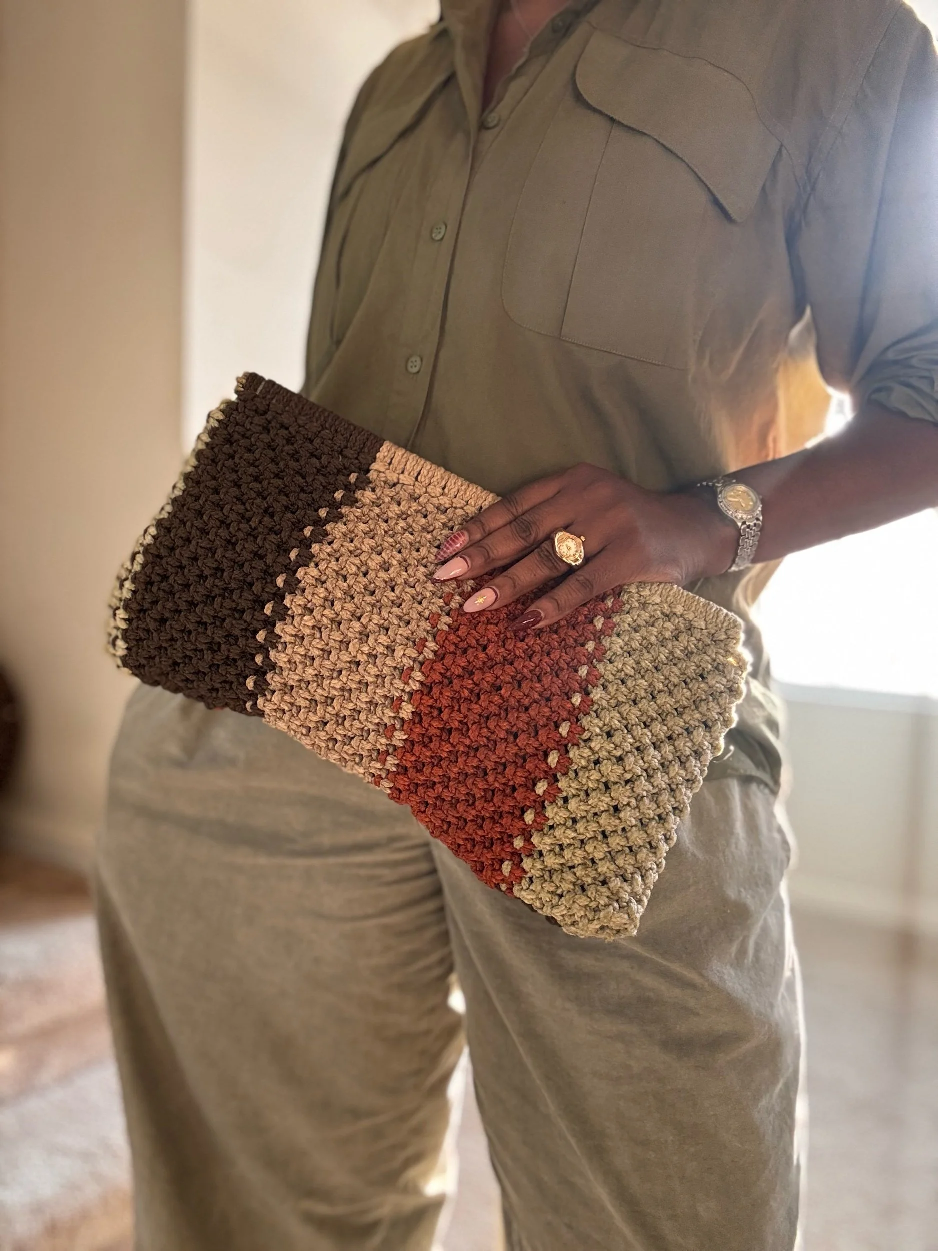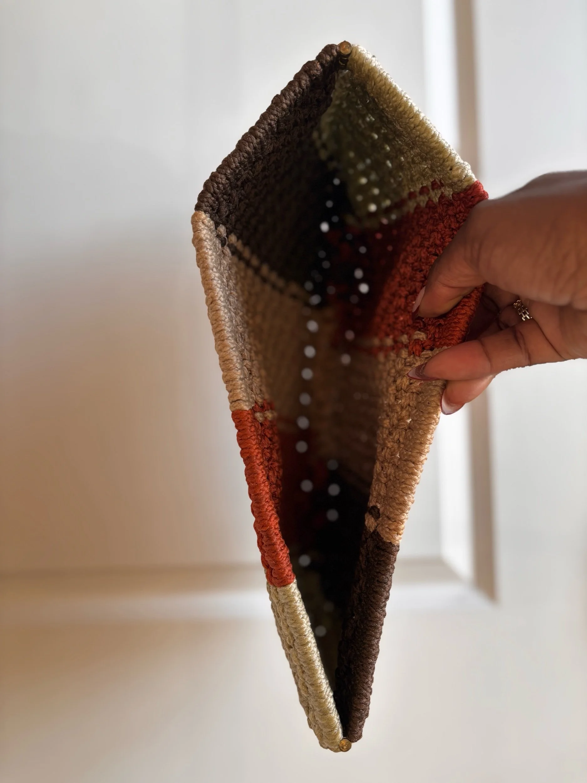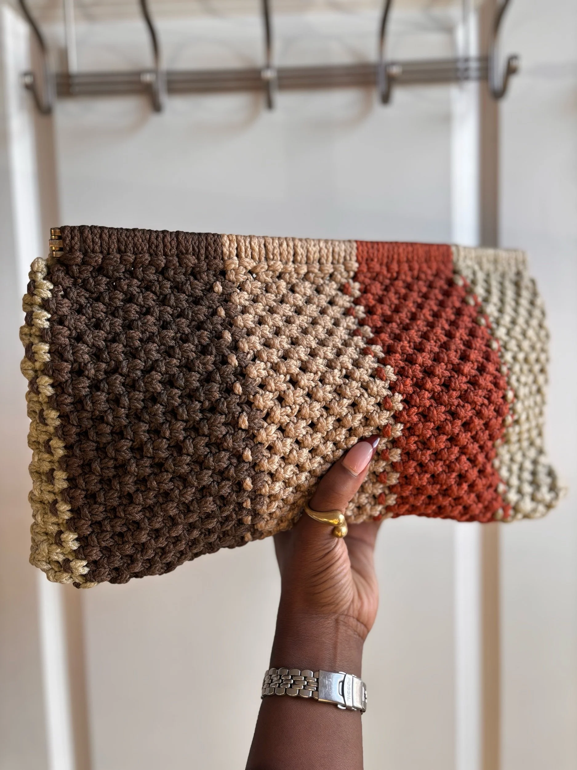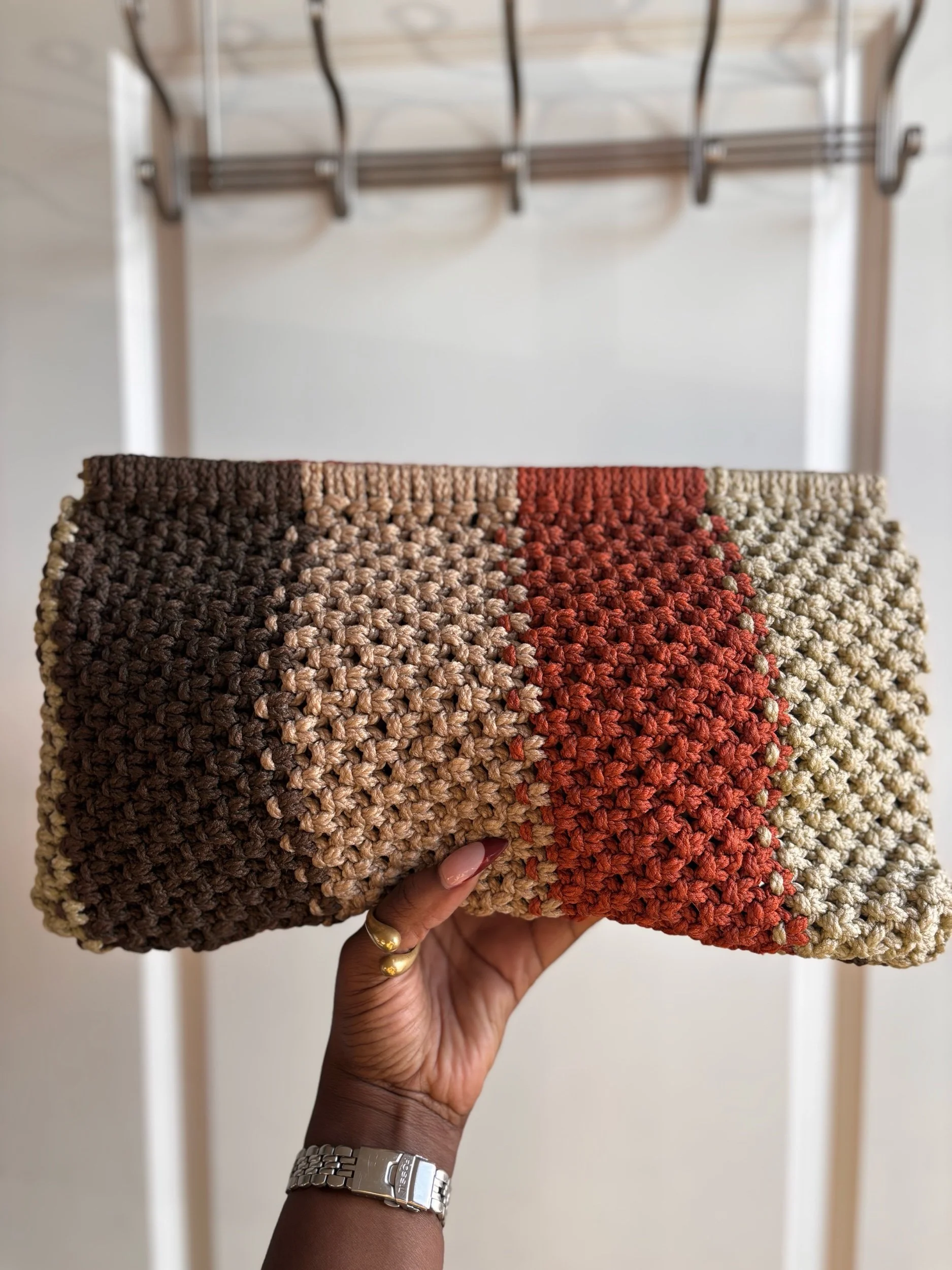 Features a crocheted body; made with materials like macrame or polyester cord. Two large wood handles for added flare.