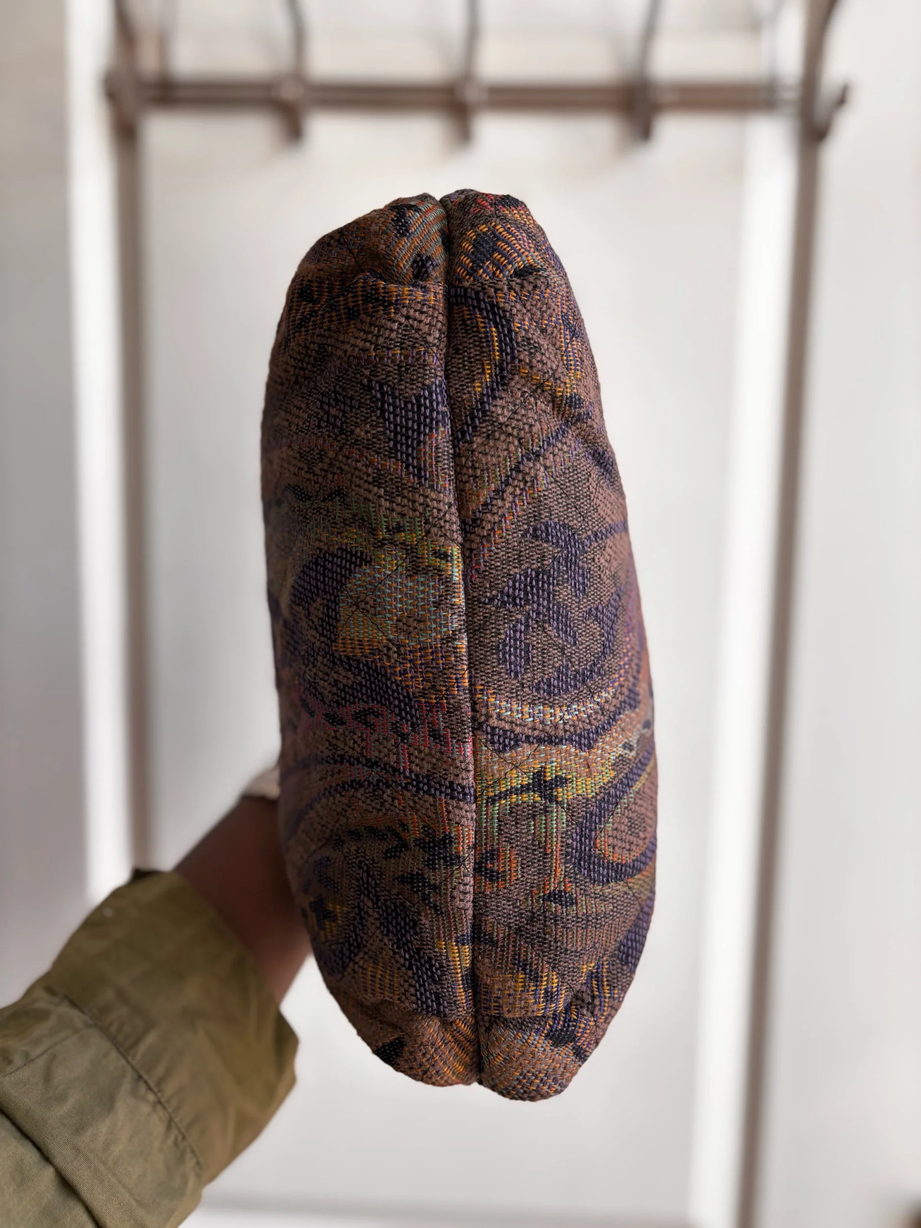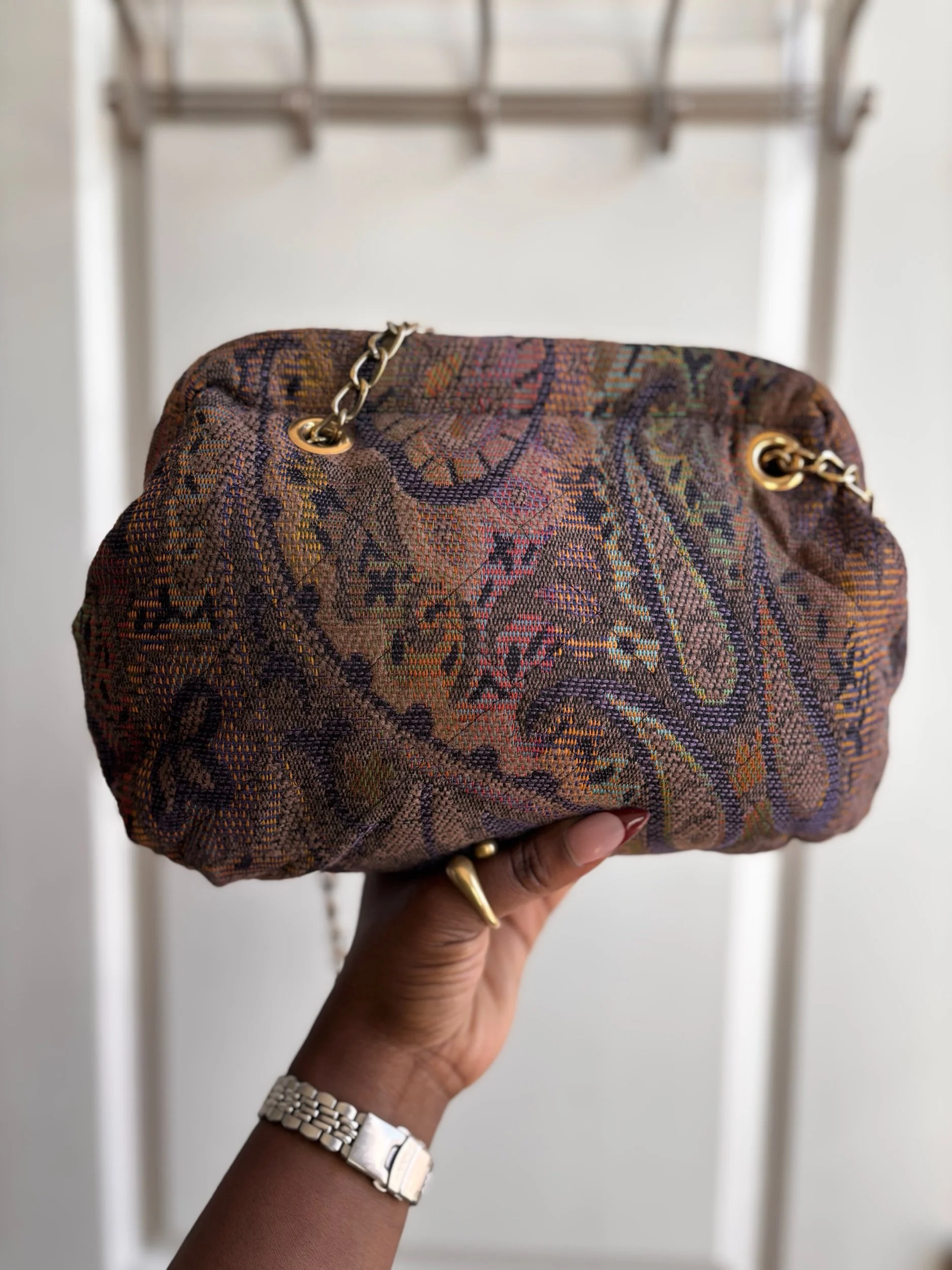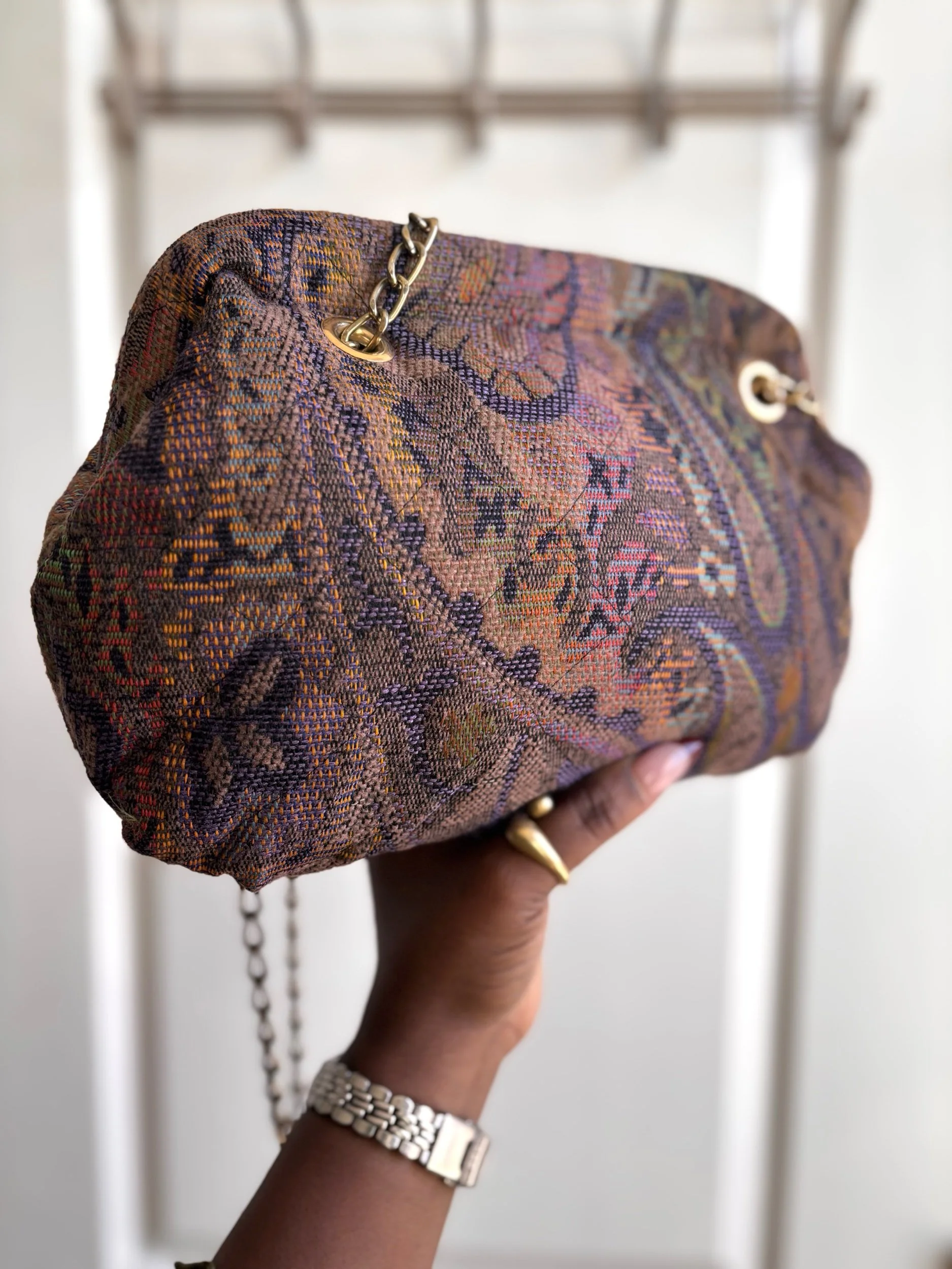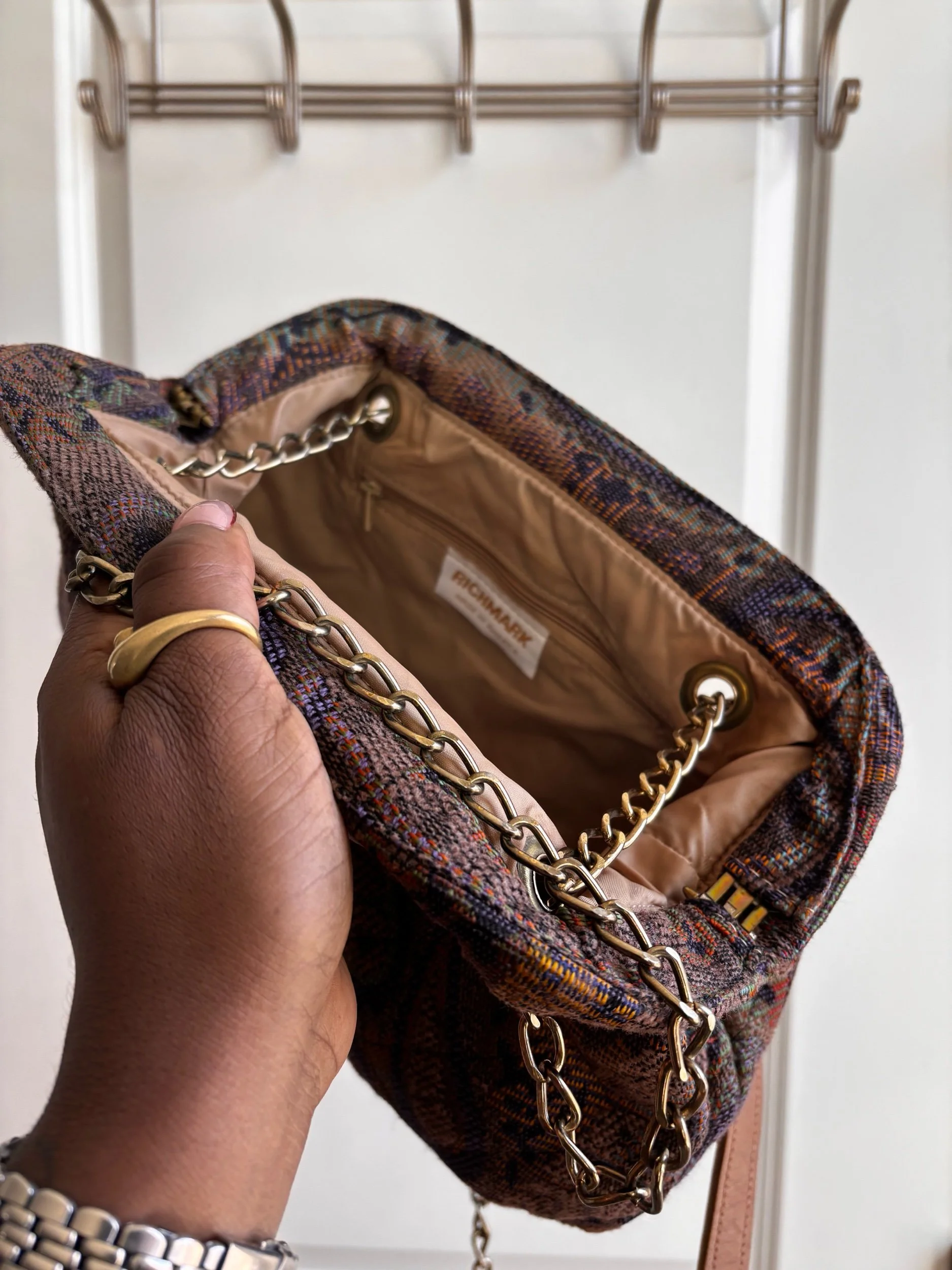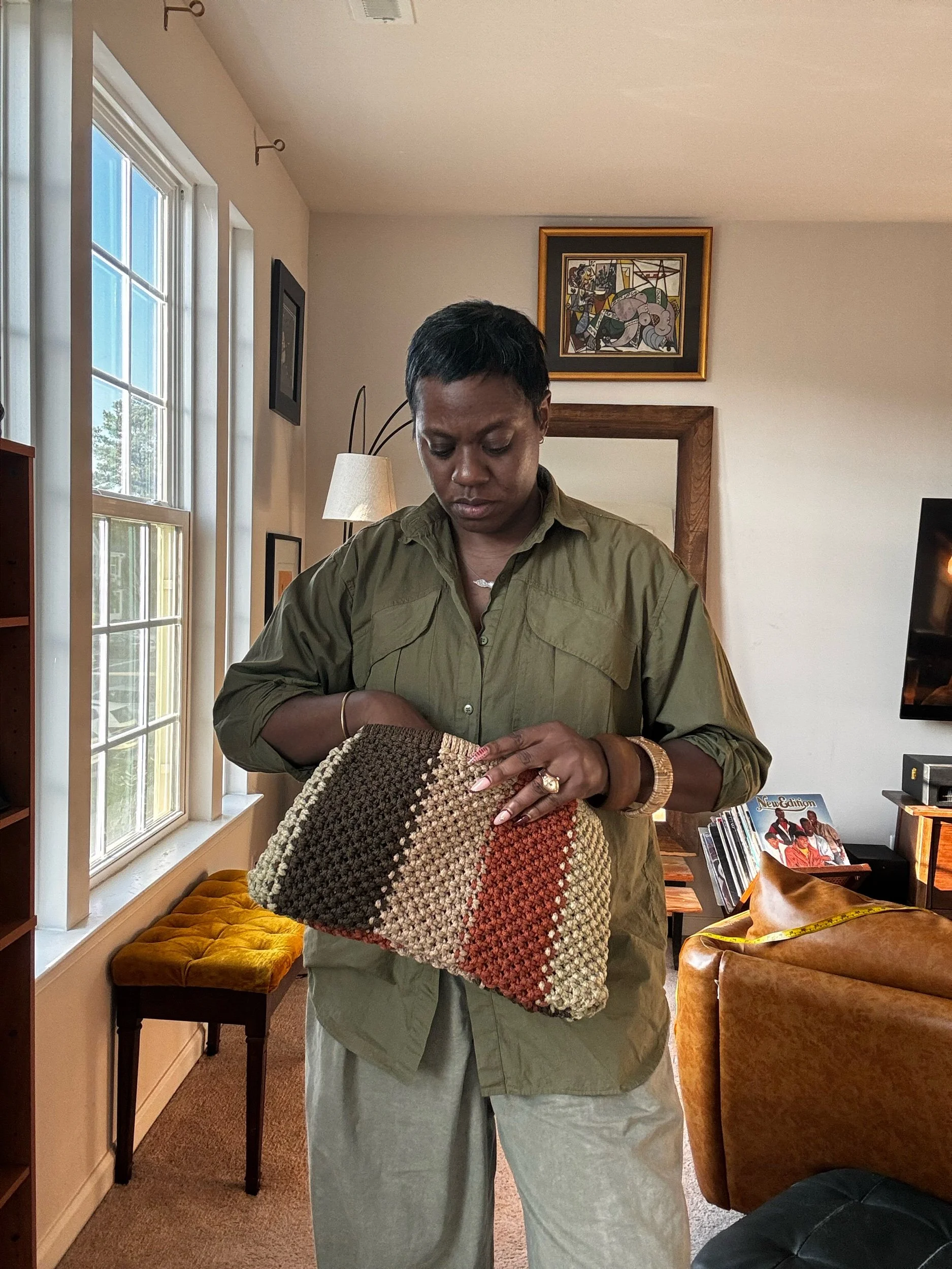 Features a crocheted body; made with materials like macrame or polyester cord. Two large wood handles for added flare.