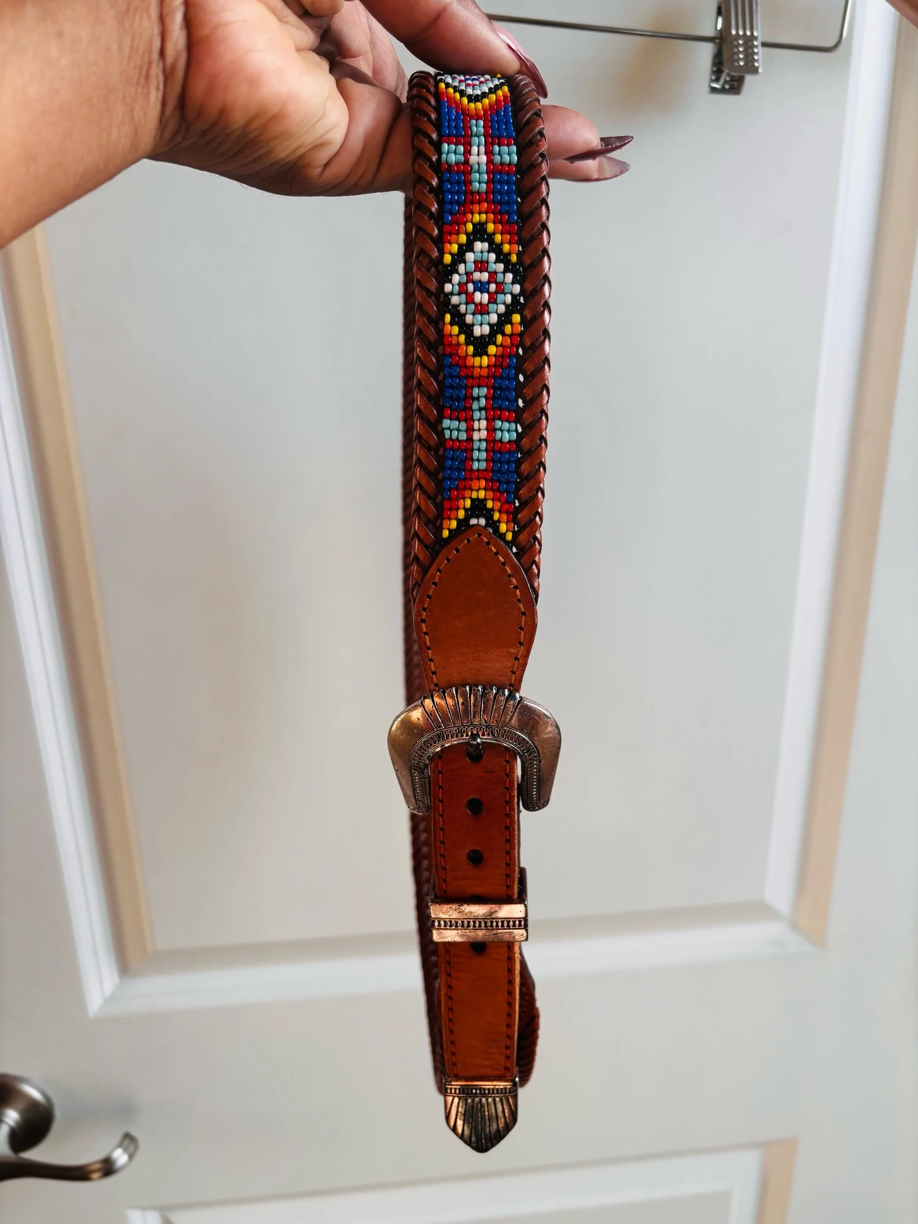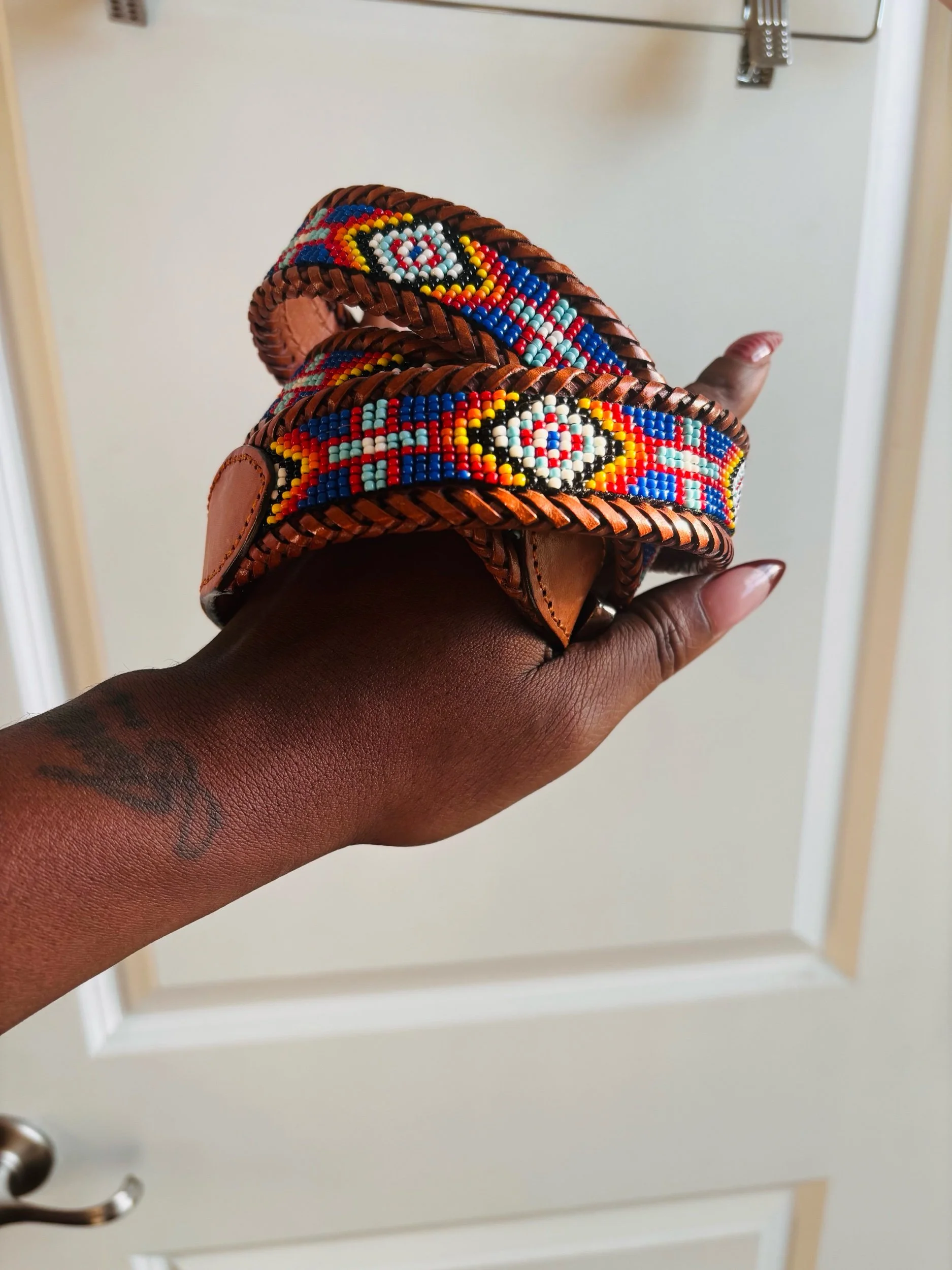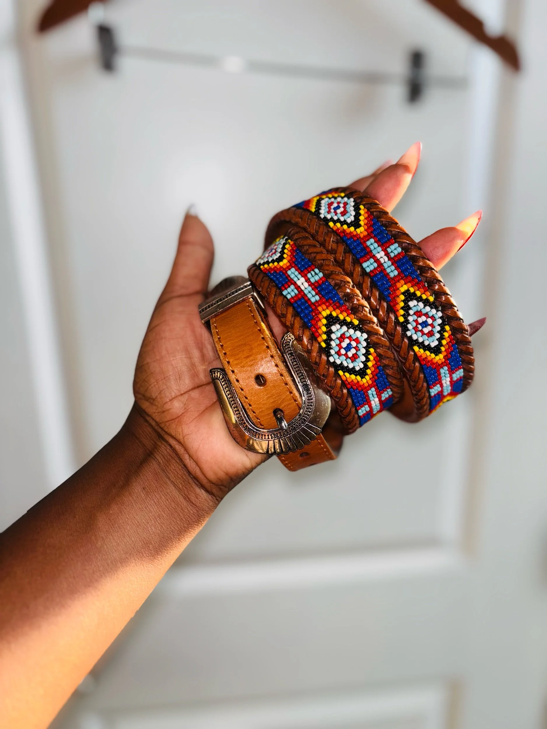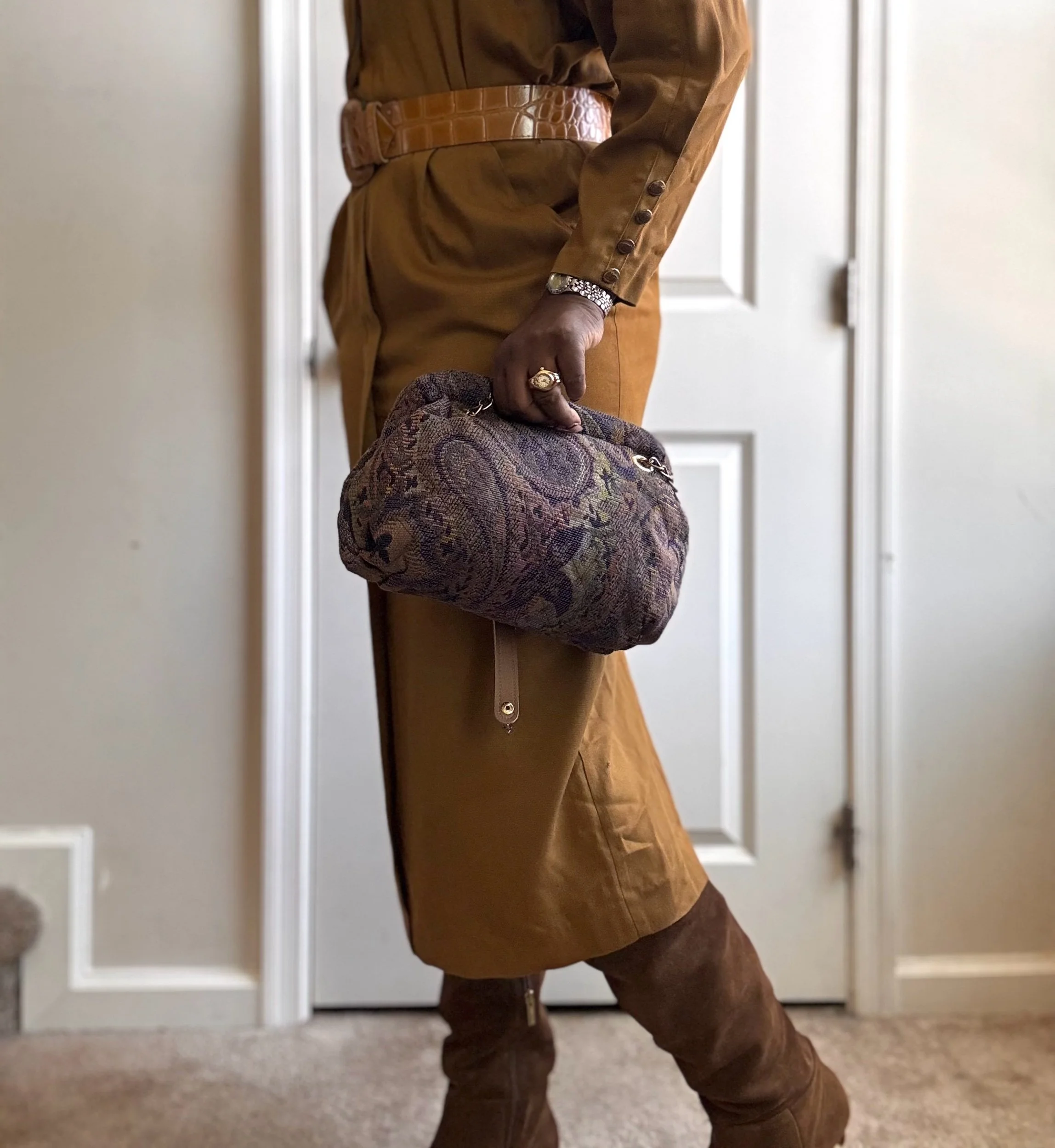 Features a crocheted body; made with materials like macrame or polyester cord. Two large wood handles for added flare.