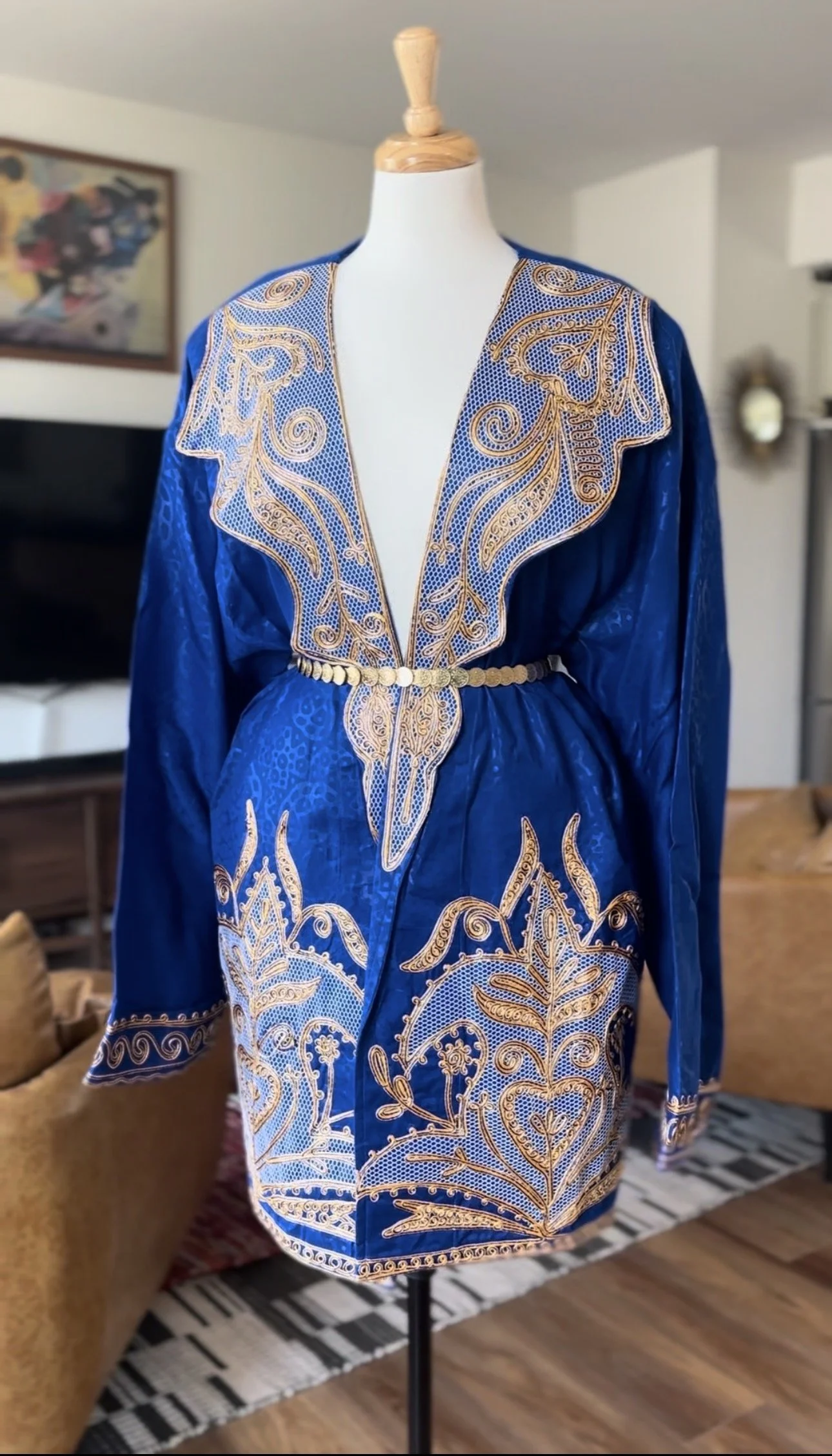 Rich in color and detail, this African Village piece features a deep indigo base brought to life with intricate gold embroidery throughout. The plunging neckline is framed with ornate, symmetrical patterns that flow effortlessly into the body of the garment, creating a striking yet balanced silhouette. Lightweight with a relaxed drape, it moves beautifully whether worn loose or cinched at the waist.