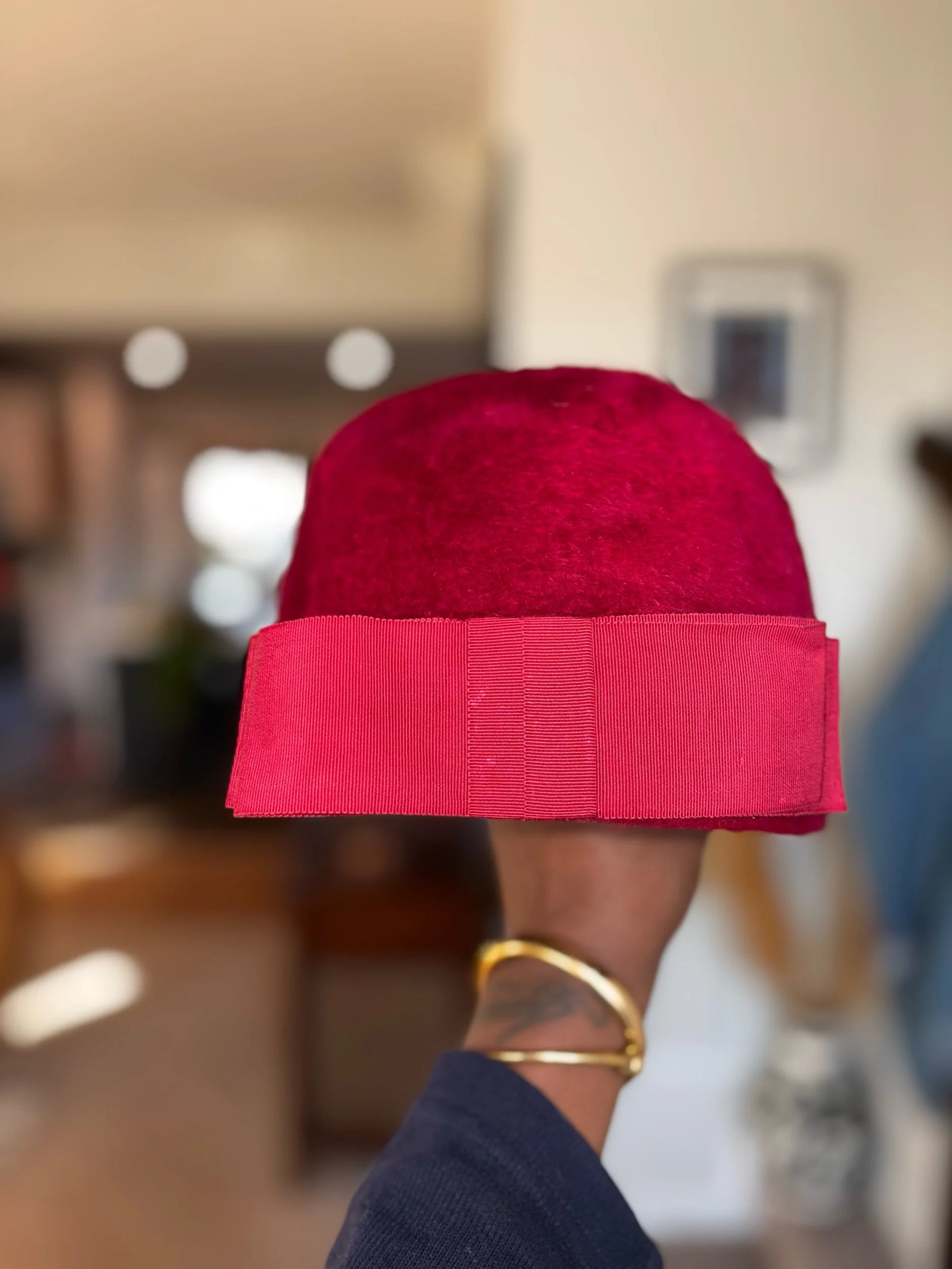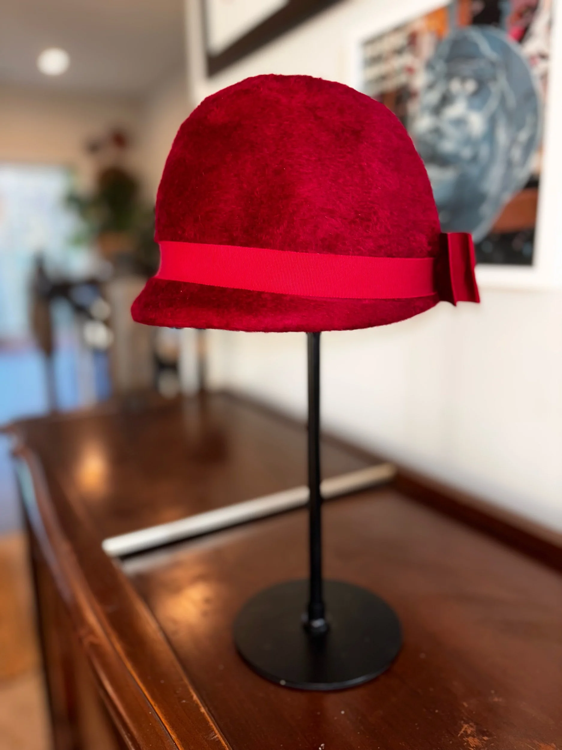 A classic vintage red felt cloche hat featuring a softly rounded crown and a grosgrain ribbon band finished with a subtle back bow detail. The felt has a rich, velvety texture and a timeless silhouette that feels both refined and bold.