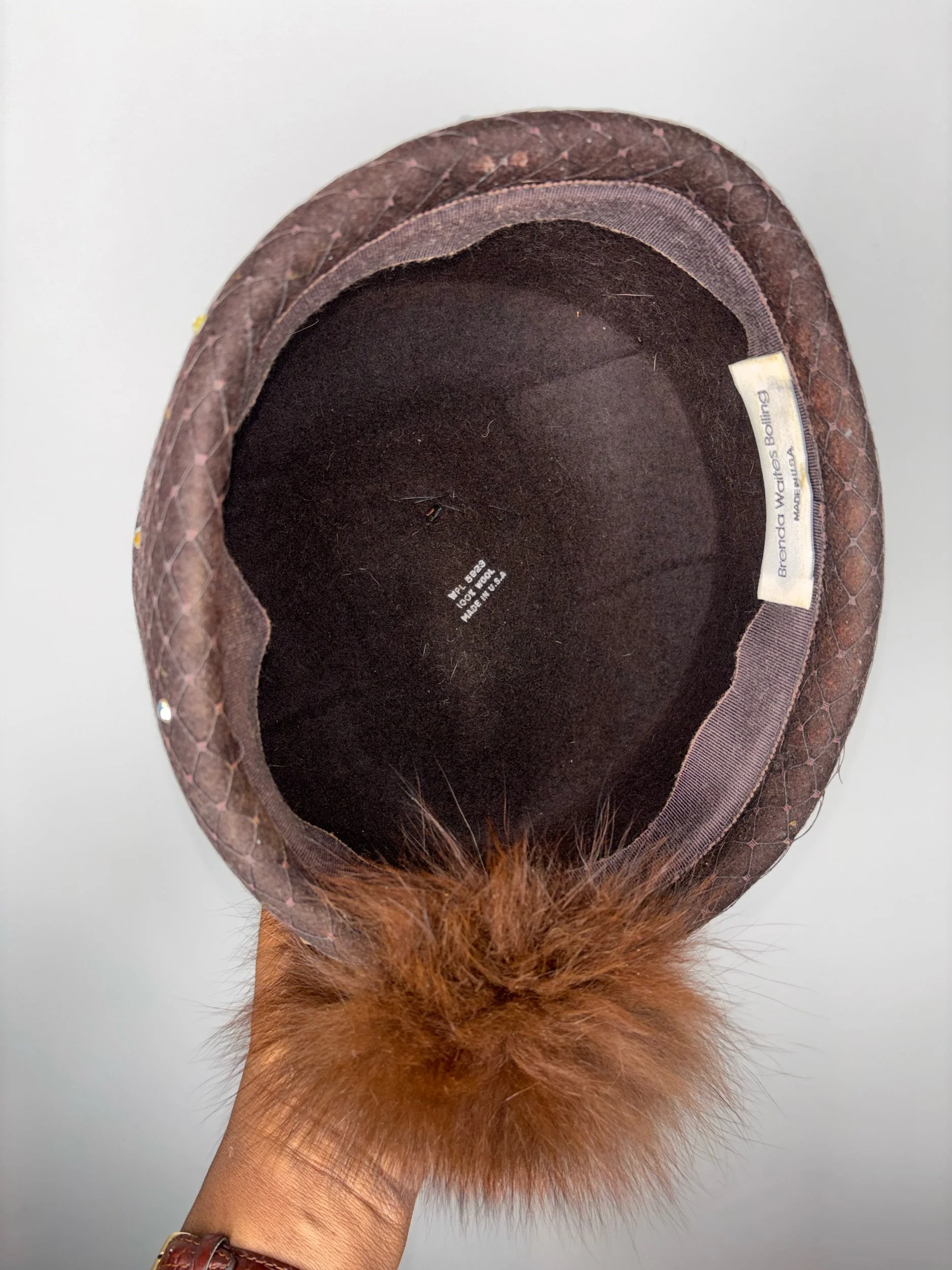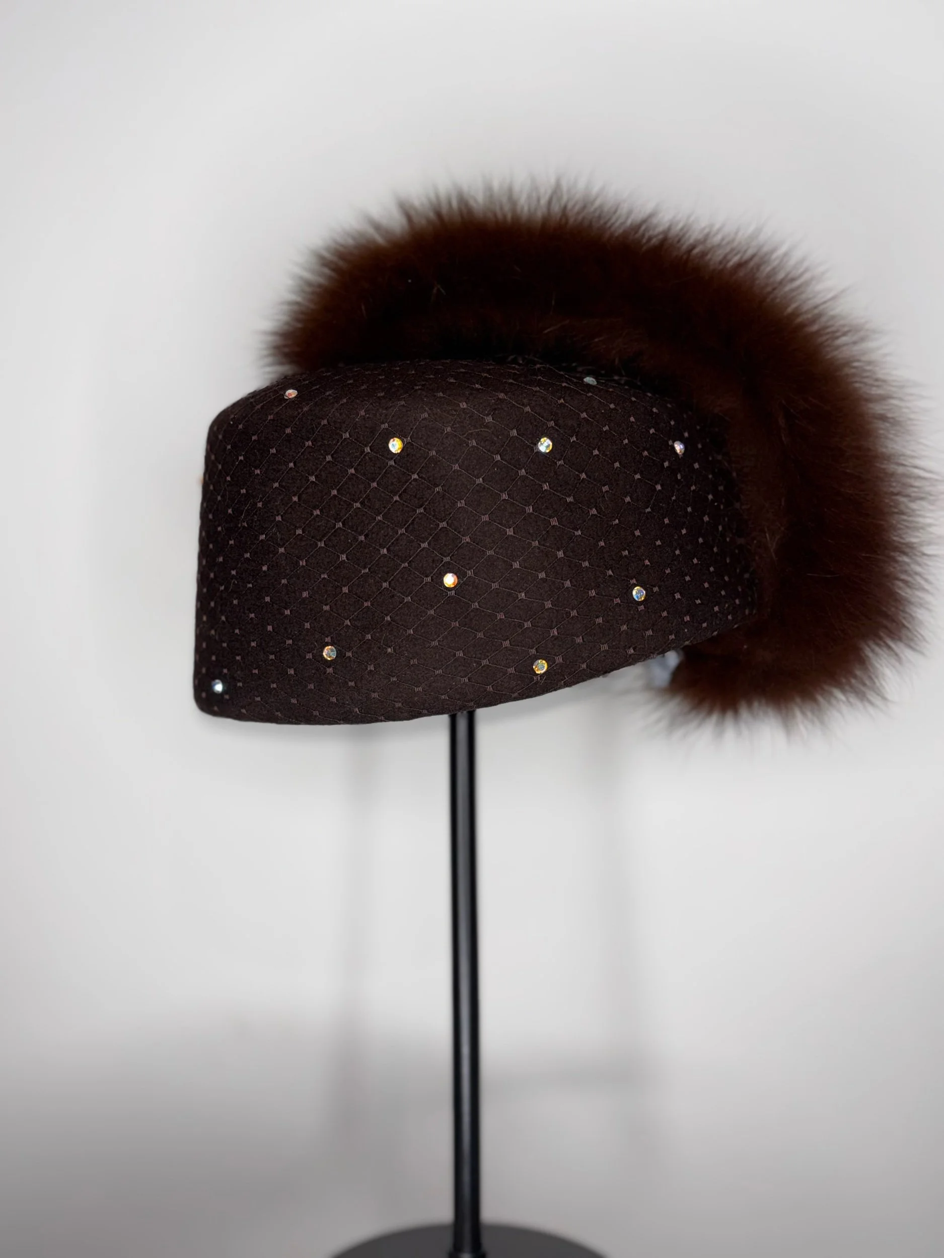 A true statement piece by Brenda Waites, this beautifully crafted boiled hat is made in the USA and designed with intention, texture, and quiet luxury. The structured pillbox silhouette features a rich brown quilted fabric accented with delicate rhinestone embellishments, creating subtle sparkle without overpowering the design. Finished with a plush fur trim that adds warmth, dimension, and unmistakable elegance.