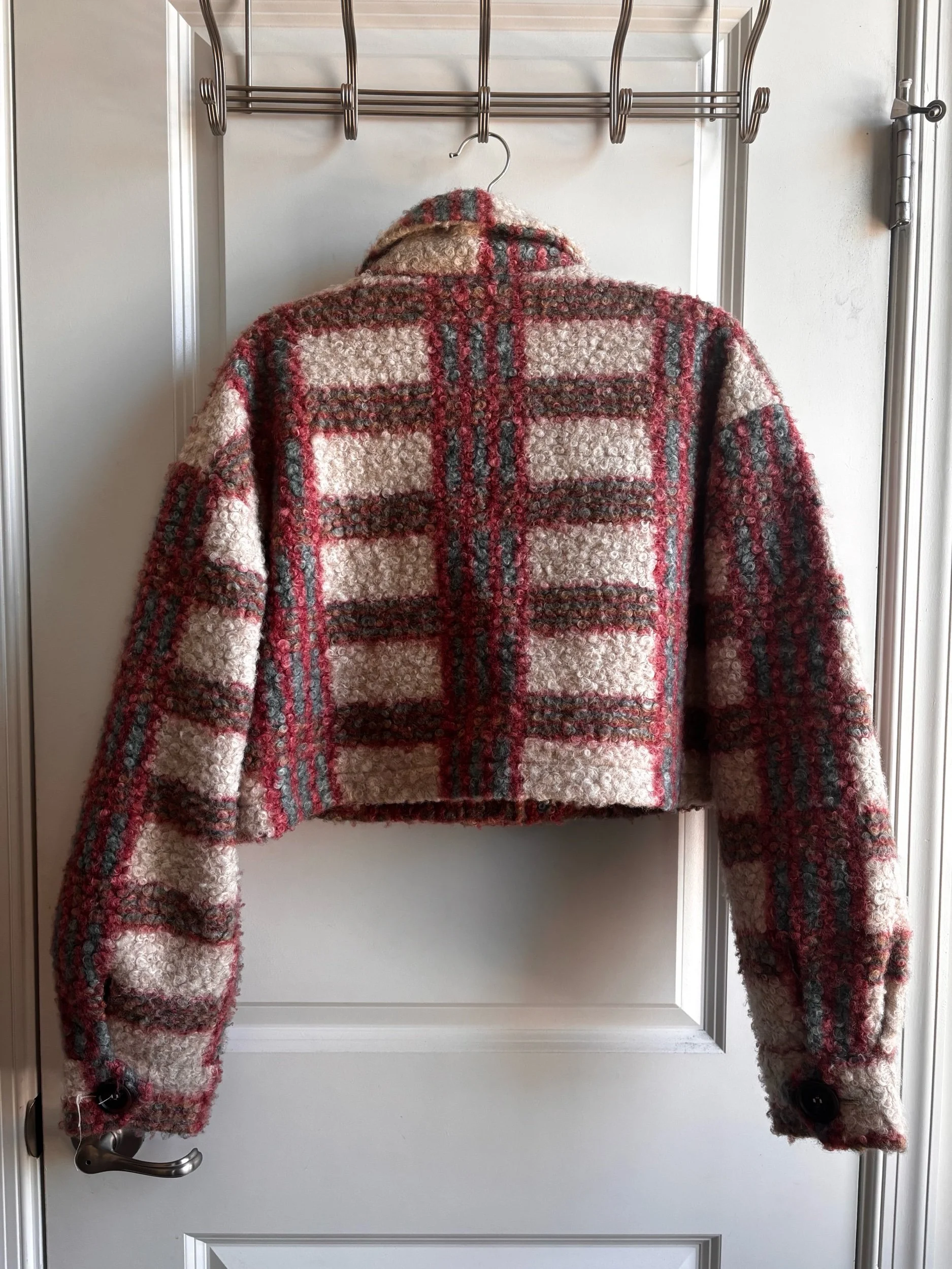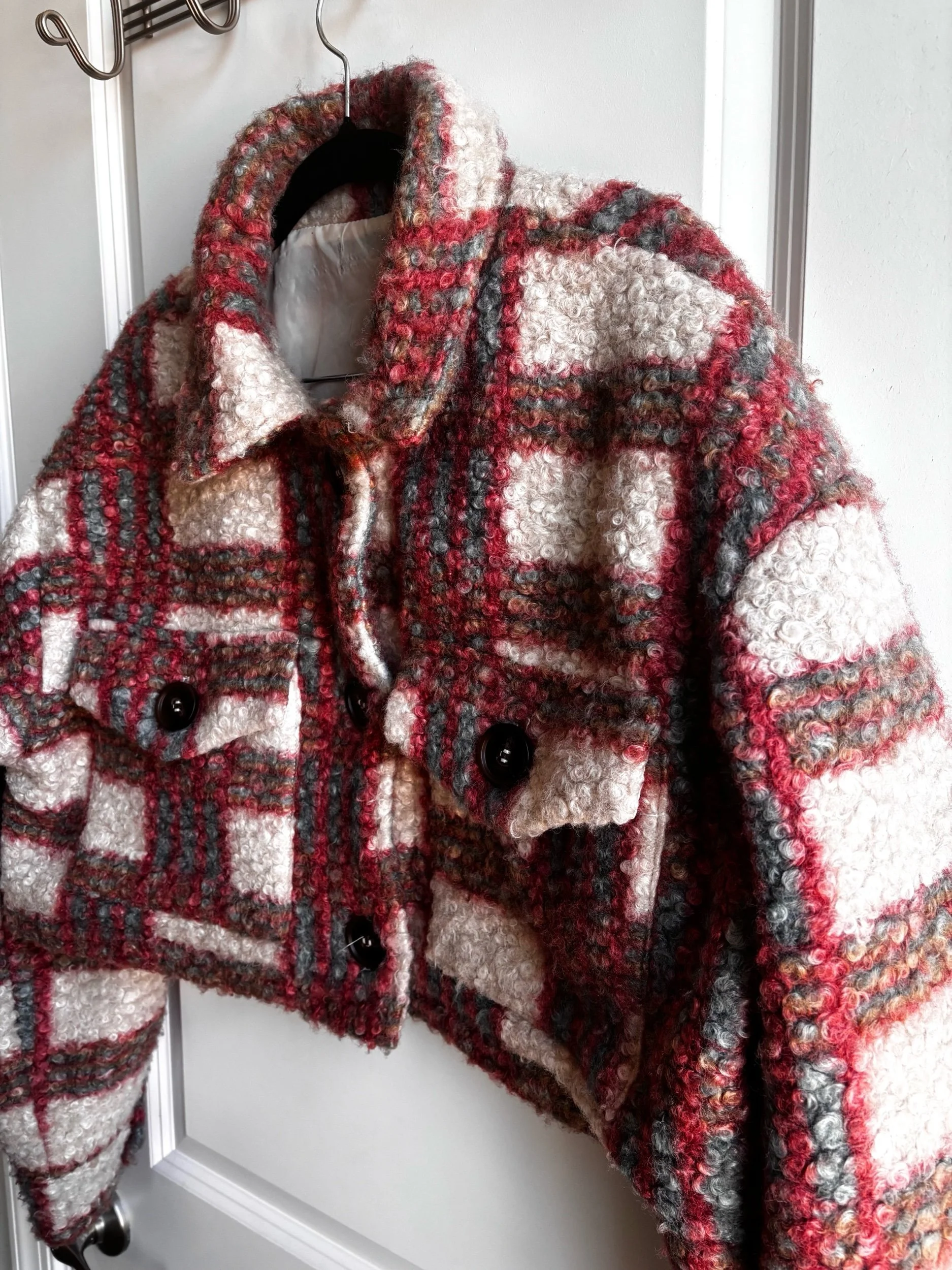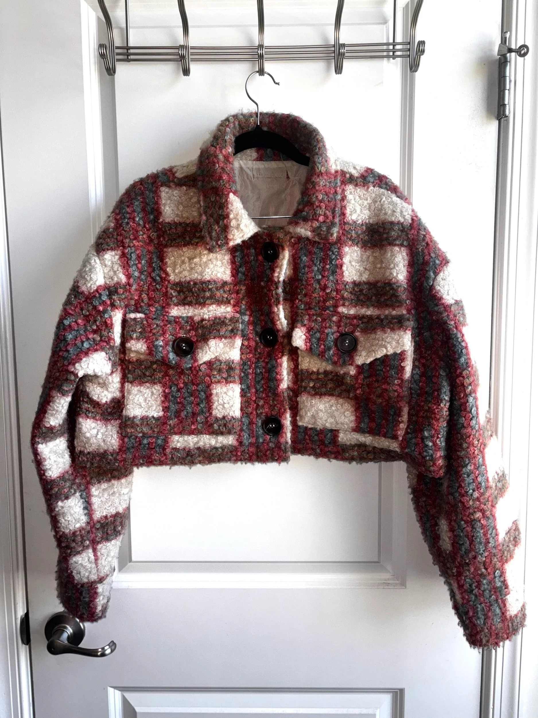 Cropped with button closure. Wrap yourself in cozy vibes with our Teddy Plaid Cropped Pocket Fall Sherpa Cropped Jacket!