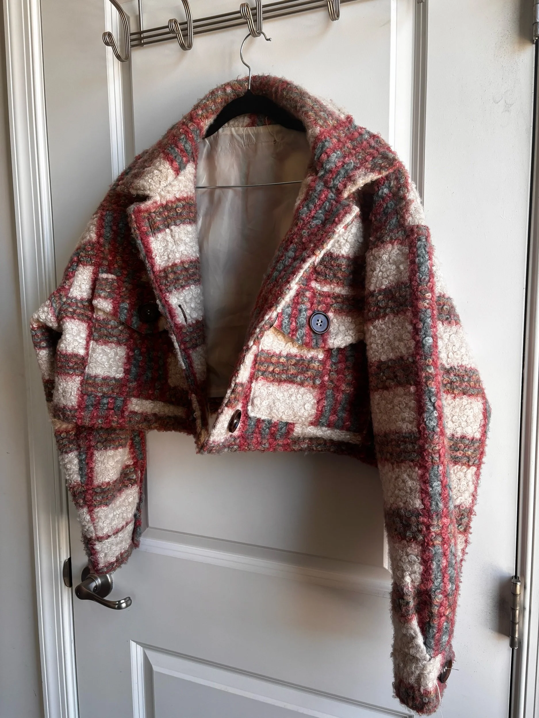 Teddy Plaid Cropped Pocket Fall Sherpa Cropped Jacket