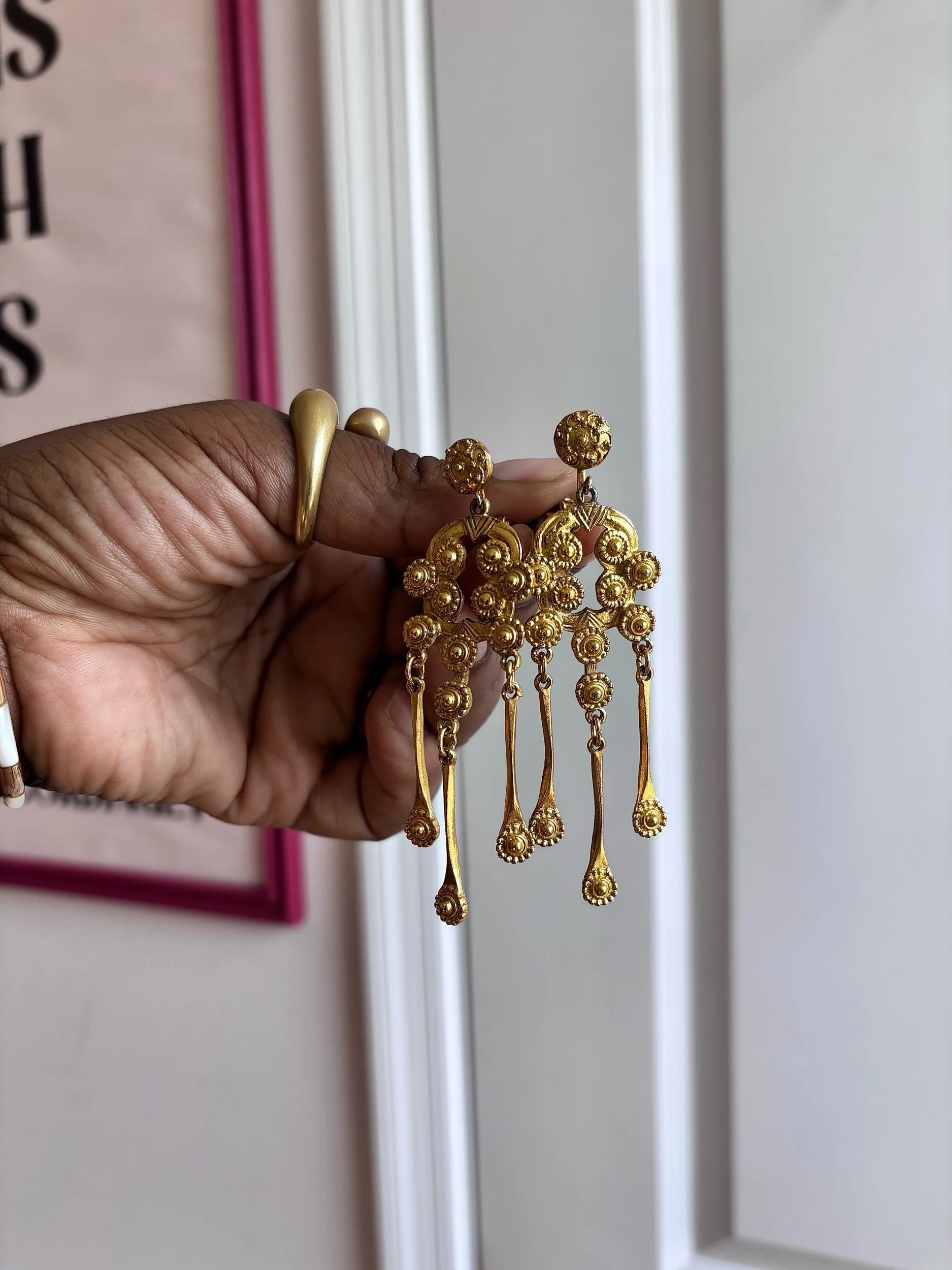 Elevate your style with these exquisite dangle gold earrings. Crafted from high-quality gold, their elegant design features a delicate drop that sways gently with movement, catching the light beautifully. Perfect for both casual outings and formal occasions, these earrings add a touch of sophistication to any ensemble. Ideal for those who appreciate timeless beauty and understated luxury, they are a must-have addition to your jewelry collection.