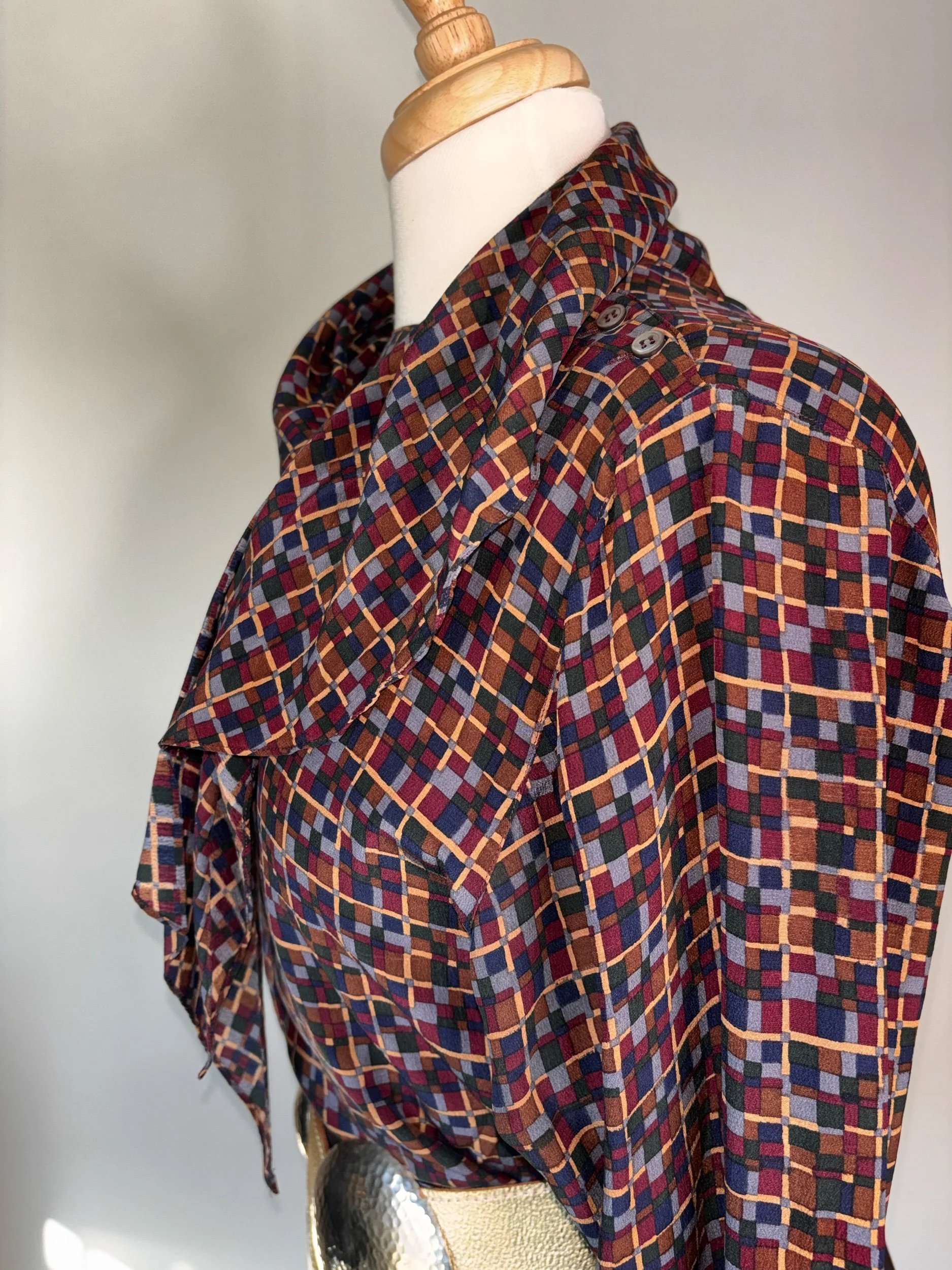 The silk speaks first. The olive and navy palette feels grounded, sophisticated, and endlessly wearable. Pair it with leather, tailored trousers, or dark denim — it does polished without trying too hard.