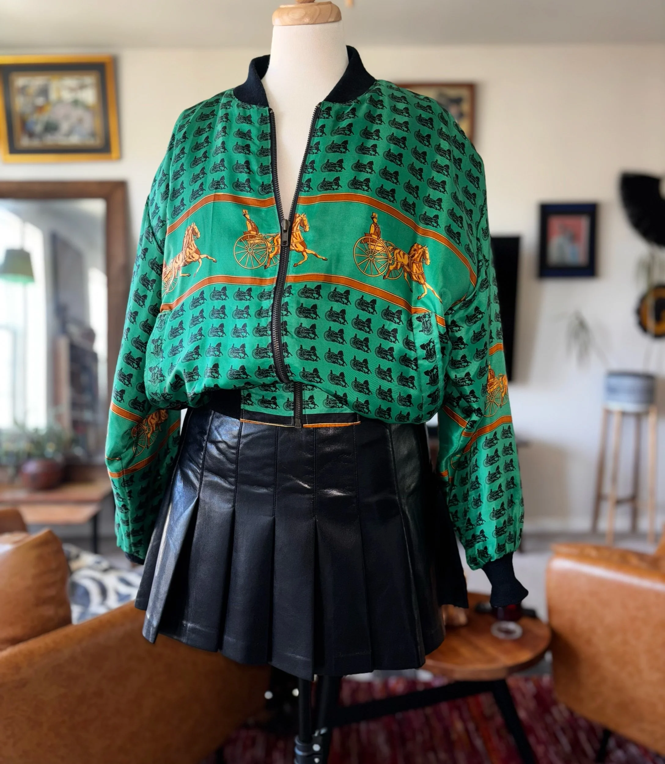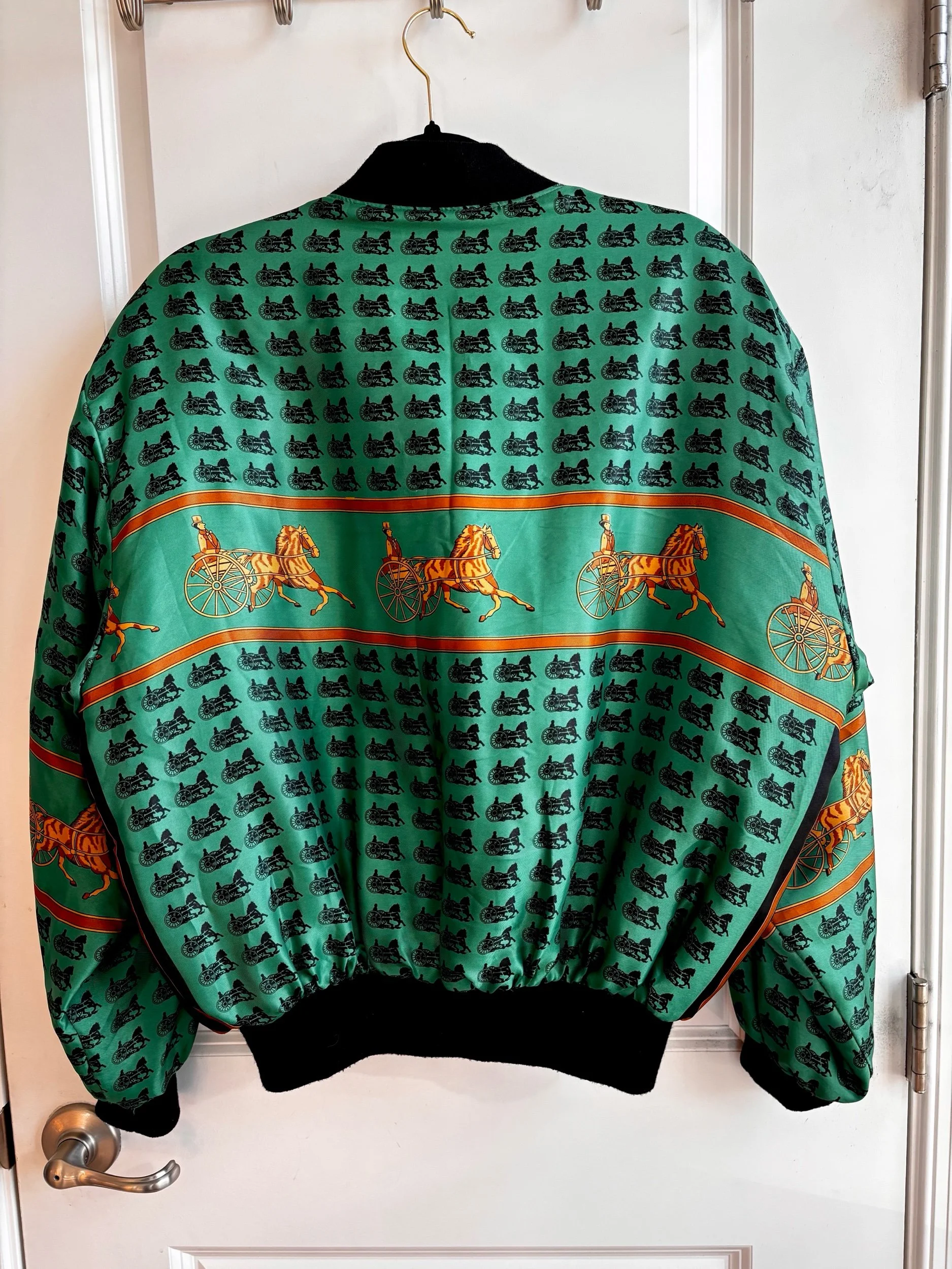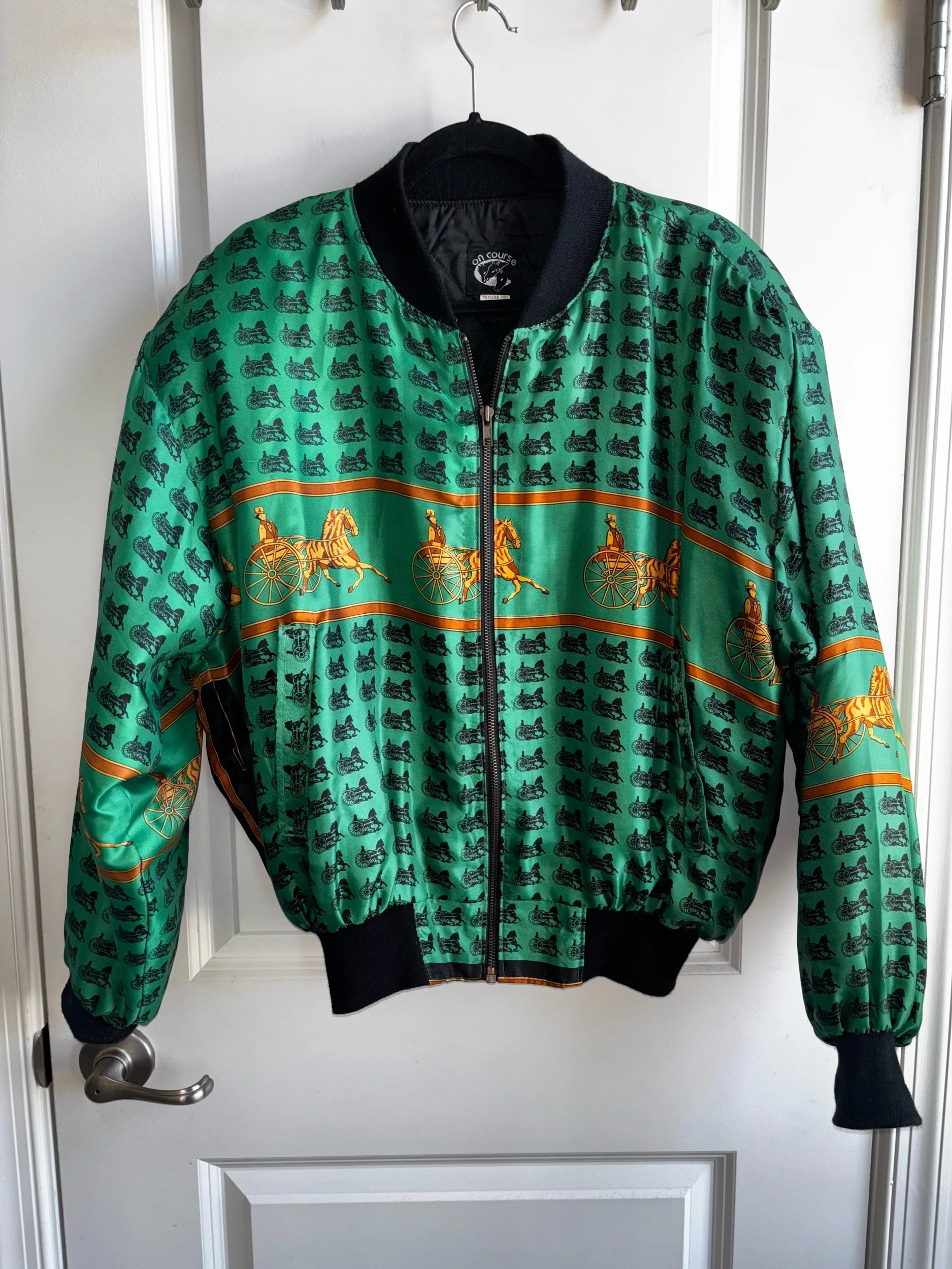 This size medium gem features a rich green and gold color combo that brings a touch of classic elegance to your casual wardrobe. The quilted interior design adds cozy warmth, while the vintage horse carriage motif gives it a playful, timeless charm. Lightly padded in the shoulders and pocketed. Zip closure. Ribbed waistband.